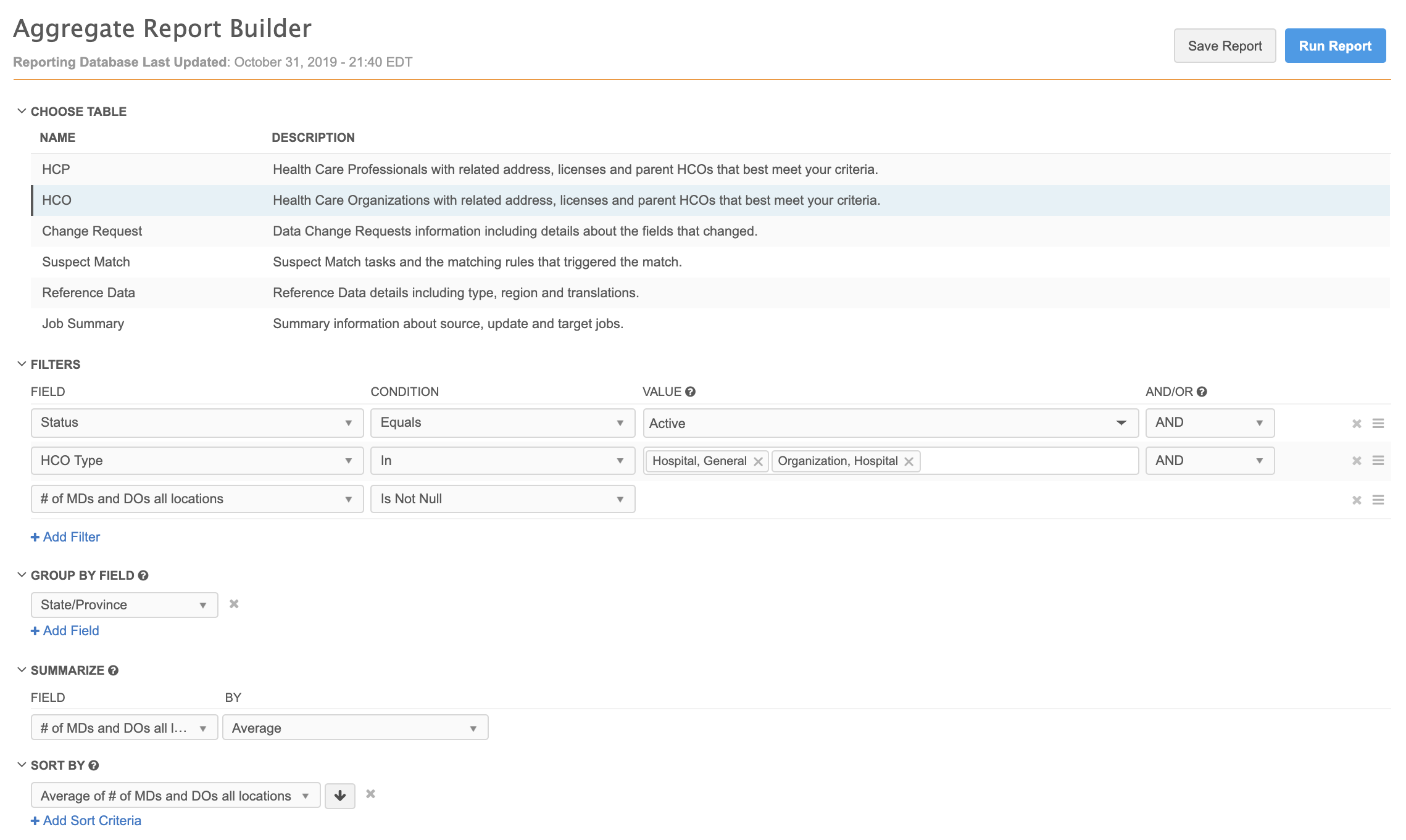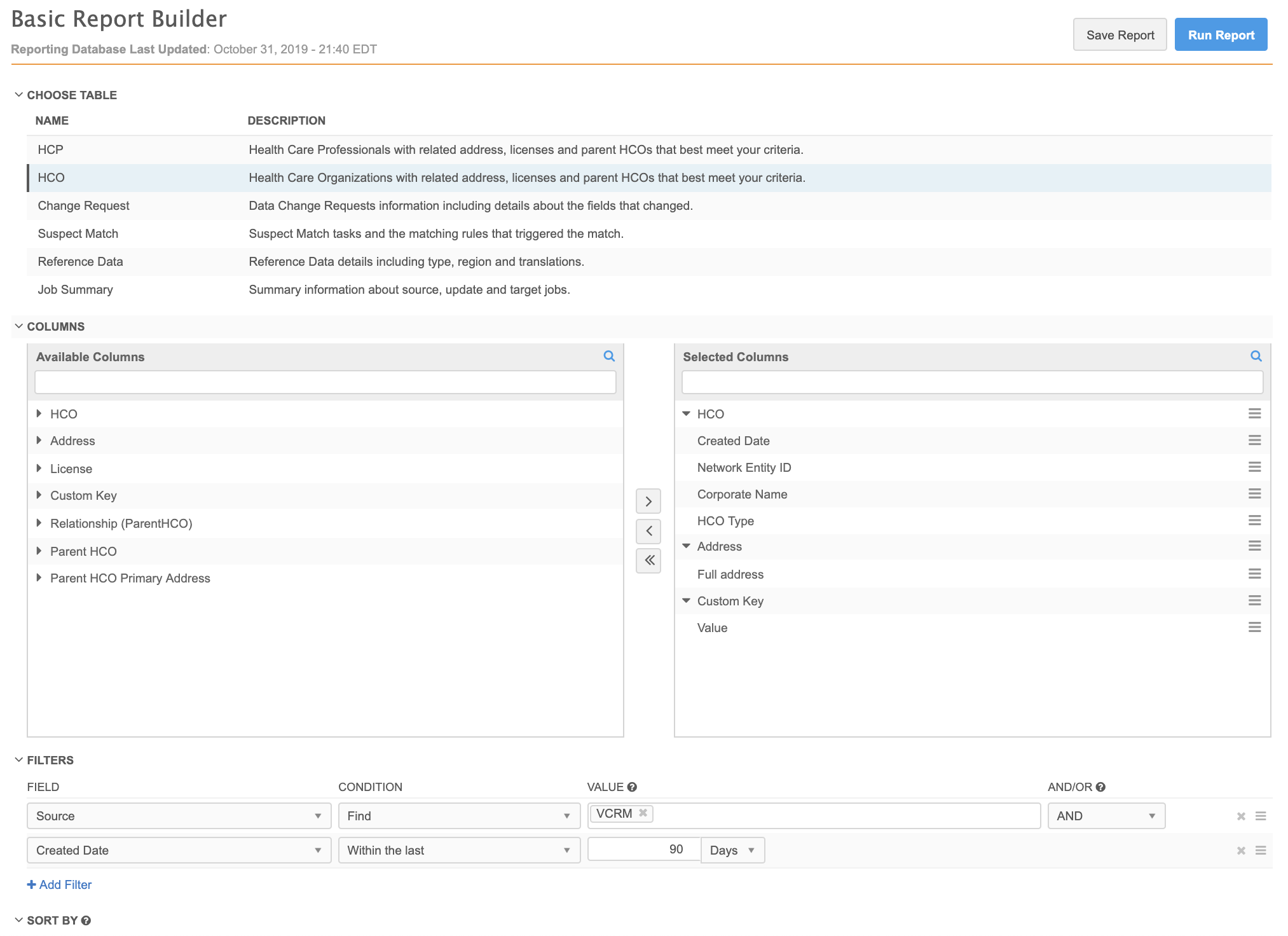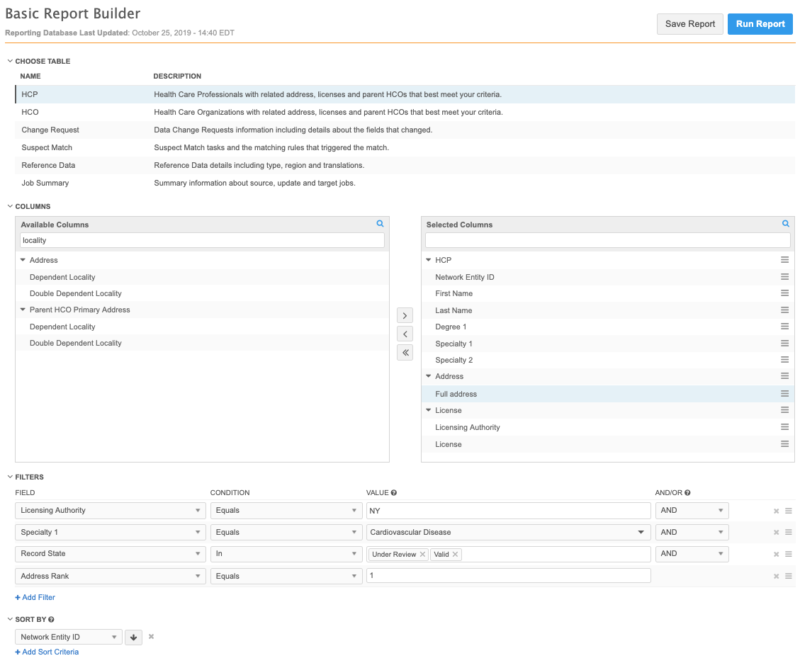Note: There is no need to filter on address ordinal since basic report queries automatically select the best address that meets your criteria. You can also return the name of the primary HCO related to the respective HCPs.