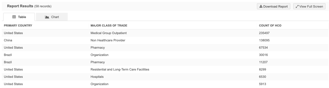 This example provides a breakdown of HCOs by class of trade and country. It also illustrates the use of group by for statistics and shorthand notation for group by and order by.