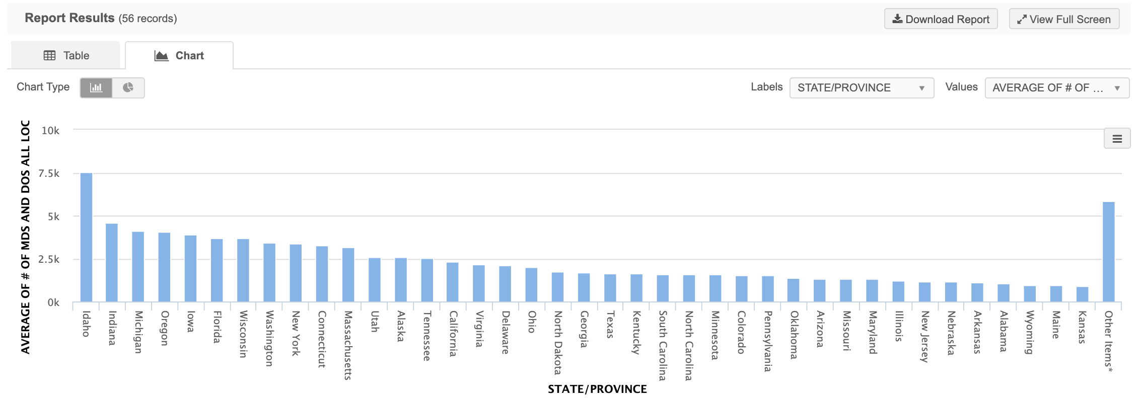 This example shows the breakdown by state of the average number of MDs and DOs working at hospitals. It also illustrates summarizing numerical fields with other functions such as average, sum, and so on.