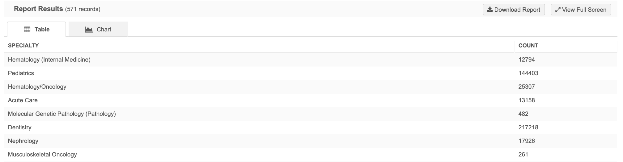 This query uses the EXPLODE expression to display the number of HCPs that have a particular specialty. The EXPLODE function scans all ten specialty fields.