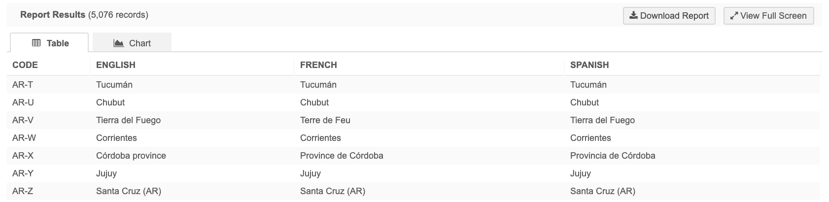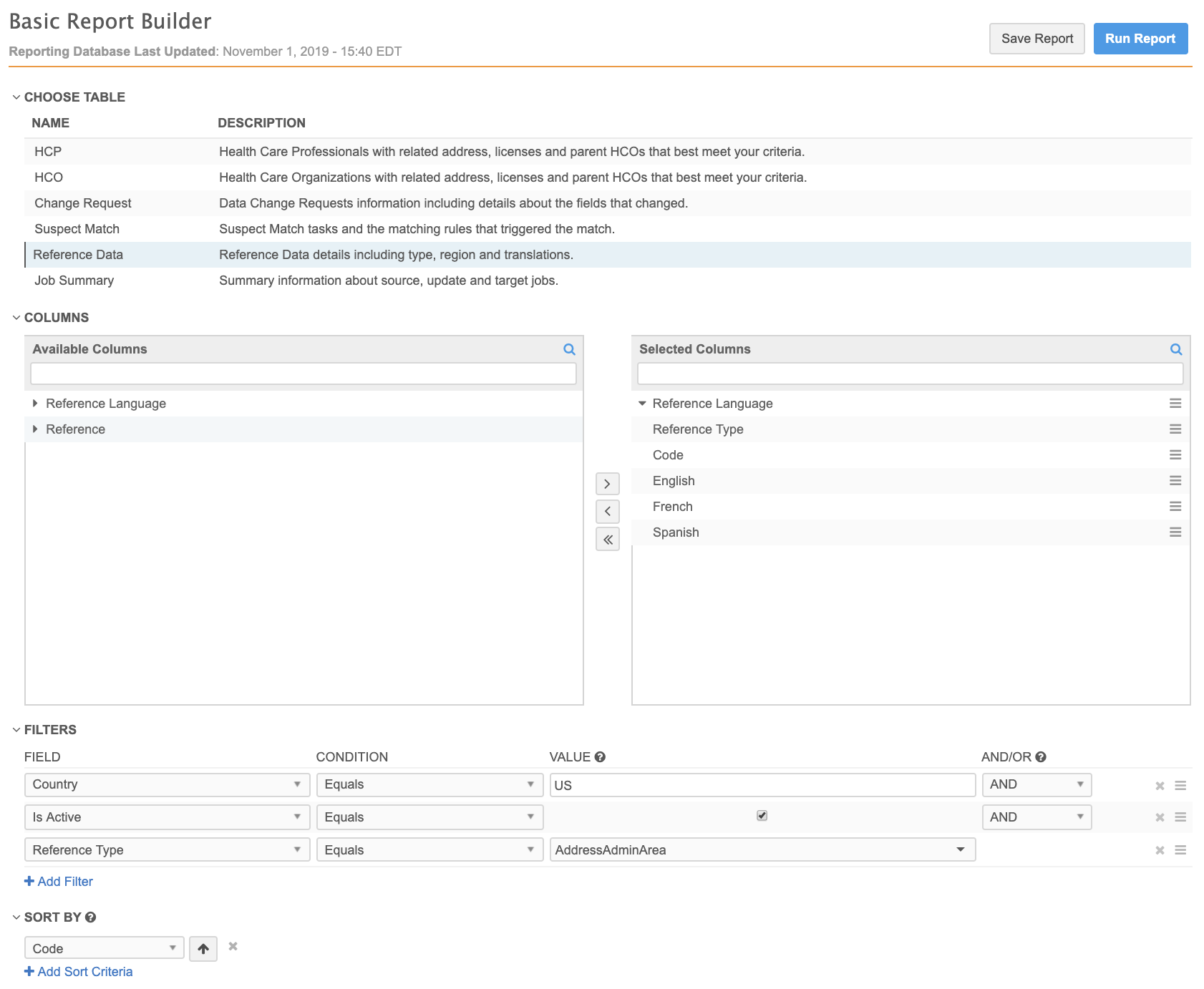 Note: Reference fields are stored as codes, so queries sorted by reference fields are sorted by the code value, rather than by a particular translation. The reporting result viewer displays reference fields in your preferred language.