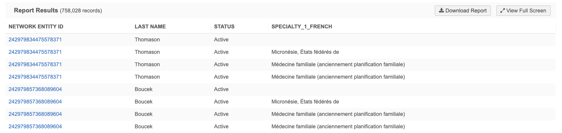 This example creates a report from which you can download reference codes and labels for multiple reference fields. As with the previous example, only the labels are shown in the initial report results in the Network UI.