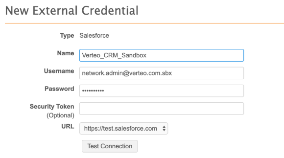 - Add the Salesforce username and password; for example, <network.admin>@.verteo.com.sbx.