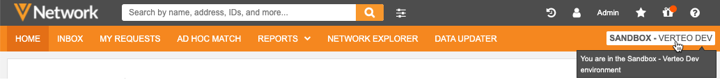 A Sandbox tag displays throughout the Sandbox instance; on the Network menu bar and in the Admin console. It displays the instance name so you can identify the instance you are in if you have multiple instances.