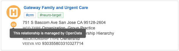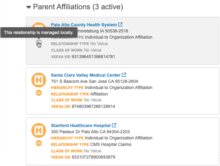 In these examples, the related entity (HCO) is managed by Veeva OpenData and the Parent HCO relationship is locally managed.