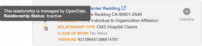 Relationship objects contain Affiliation badges to identify if the relationship is locally managed, managed by OpenData, or managed by a third party data provider.