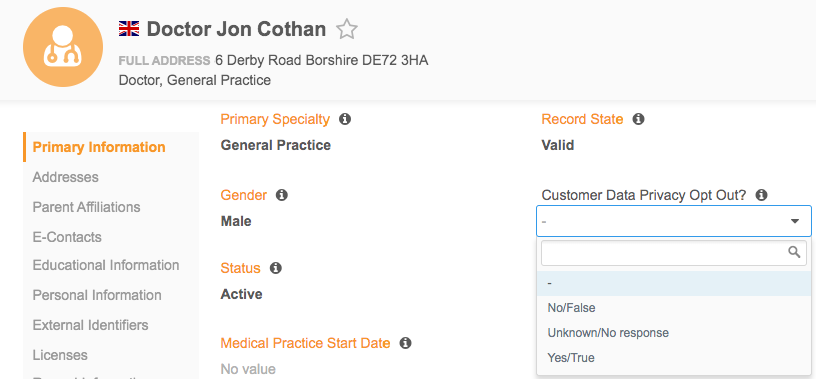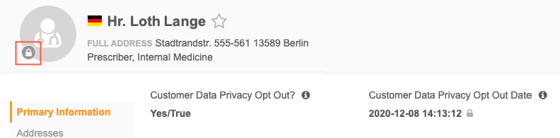 Administrators can enable the Customer Data Privacy Opt Out? field. When the field is enabled, it displays in HCP record profiles. Data Stewards can use the field to opt out HCPs in the profile.
