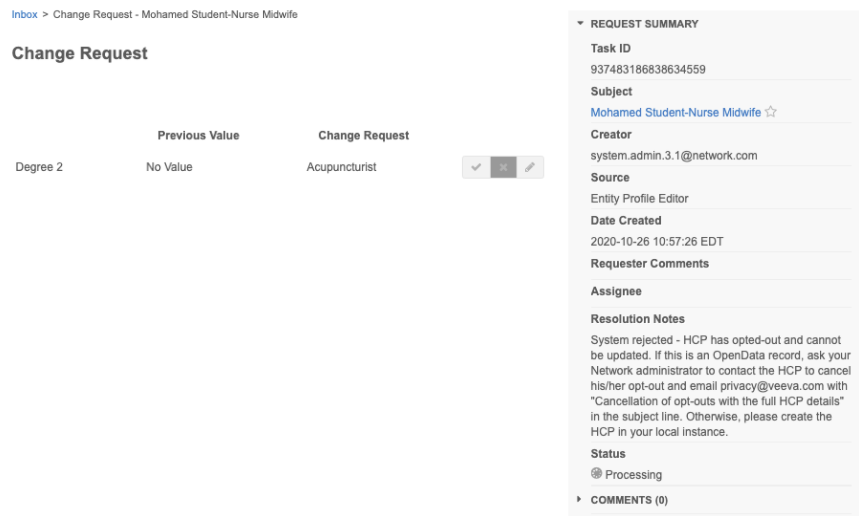 If a DCR is pending for a record and then the record is opted out, the task will be automatically rejected when it is opened. The user that submitted the change will no longer be able to view the HCP's name in the task; it will be masked with "Data Privacy". The "System rejected" resolution note advises that the HCP has opted out.