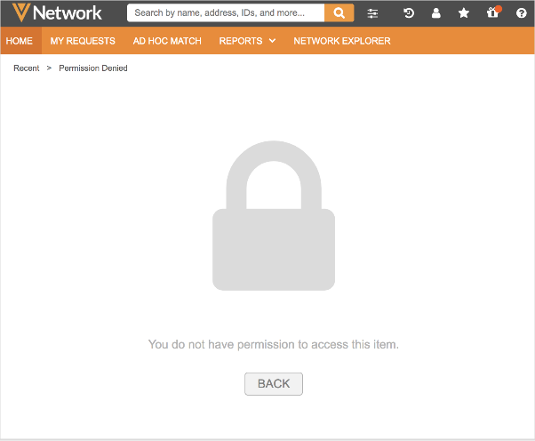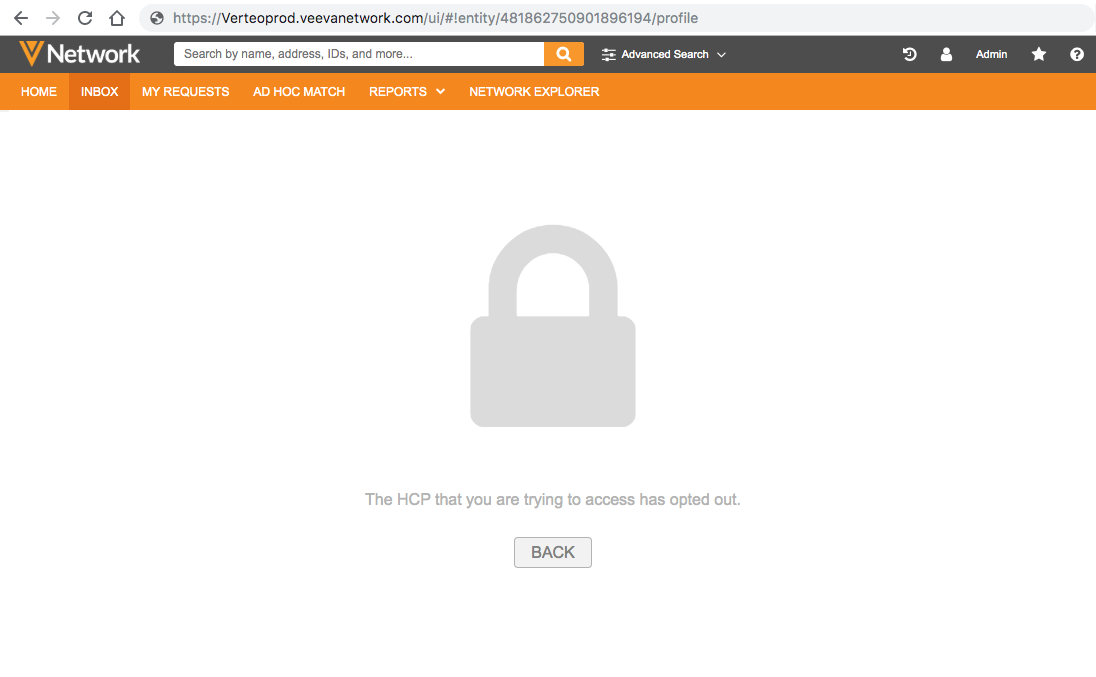 If users search for a record by appending the Network entity ID (VID) to the URL of their Network instance, a locked profile screen displays with a message advising users that the HCP has opted out.