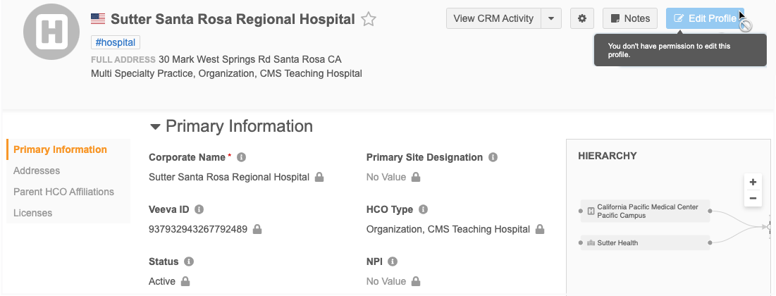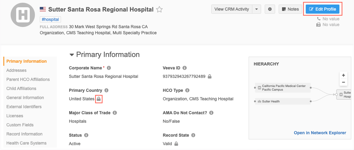 If you do not have access to edit data through your data visibility profile, the Edit Profile button is dimmed and the Lock icon displays beside all fields.