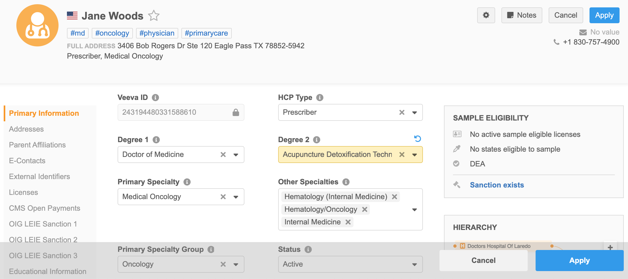 When you apply your changes, a data change request is routed to the appropriate data stewards. Changes to Veeva OpenData data in Veeva-managed records are routed to and reviewed by Veeva Data Stewards. Similarly, changes to third-party managed records are routed to and reviewed by third-party Data Stewards.