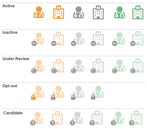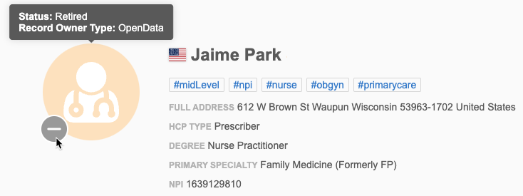 If the record is flagged as opted out, the Opt Out badge takes precedence over the other indicators; for example, if an HCP is opted out, the Opt Out badge displays even if the HCP is active with a valid record state.