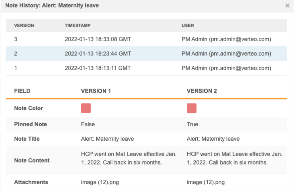 Use reports to understand the differences between the versions of a note. The Note History displays a snapshot of the note contents for each version. The version changes after existing content is changed and saved. This behavior is different than a record's revision history which stores the difference between each version.