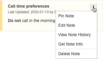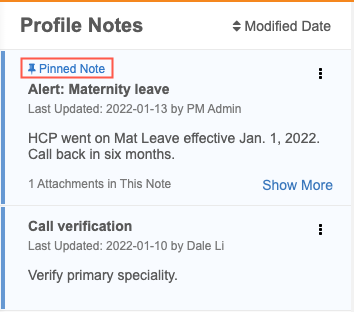 Pin a note so it displays at the top of the Profile Notes section. By default, notes display by created/modified date. When you pin a note, that note displays above all of the sorted notes. Newest pinned notes display first.