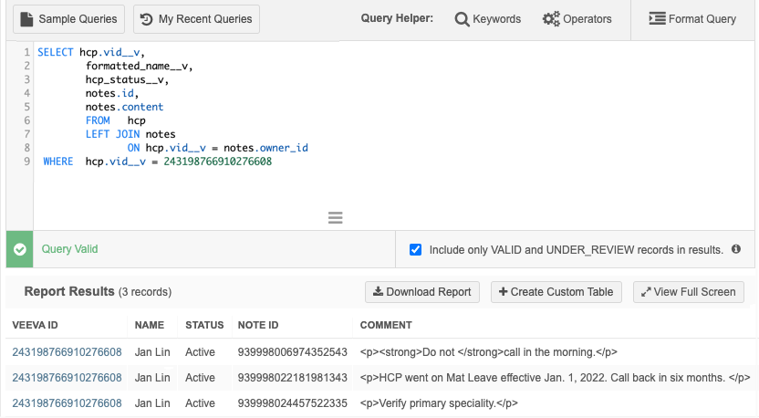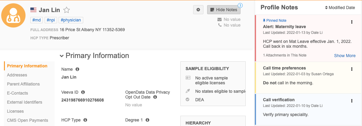 You can add notes to record profiles so other users can see the information. For example, data stewards can add a note to alert users when an HCP has taken a leave of absence, or to indicate an HCP's call time preference for data verification.