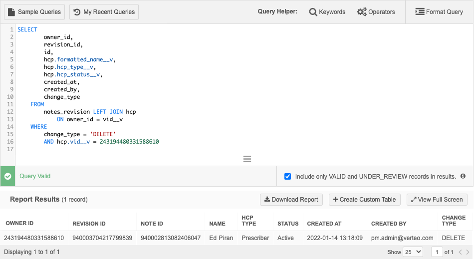 SELECT owner_id, revision_id, id, hcp.formatted_name__v, hcp.hcp_type__v, hcp.hcp_status__v, created_at, created_by, change_type FROM notes_revision left join hcp on owner_id = vid__v where change_type = 'DELETE' and hcp.vid__v = 243194480331588610
