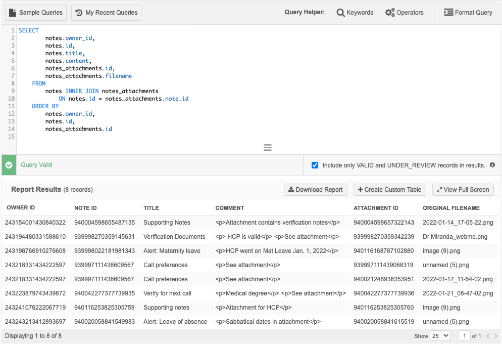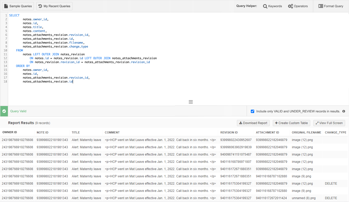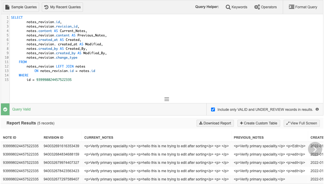 Note: When notes are deleted, their revision history is visible only in reporting. All users with access to the SQL Query Editor can run a report to get deleted notes content and revision history.