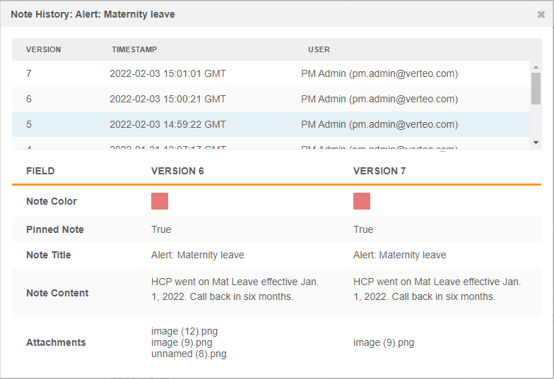 Users can add and remove attachments from notes. In the Note History example below, you can see that a user has removed two attachments from this note. When attachments are deleted, they are permanently removed from the database, but their name remains in the Note History.