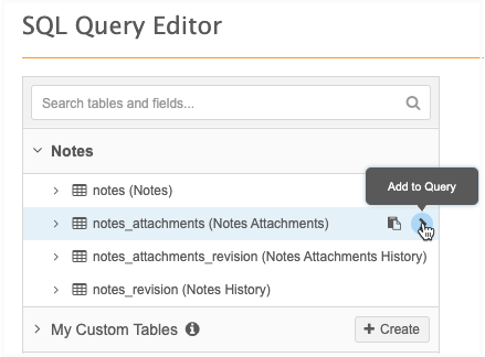 In the SQL Query Editor, expand the Notes section. The tables and fields that are available for reporting are listed.