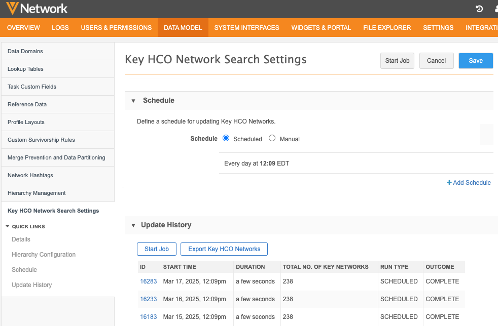 The data maintenance job key_hco_network_maintenance__v, is a Network internal job that can be managed on the Key HCO Network Search Settings page(Data Model).