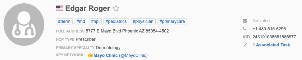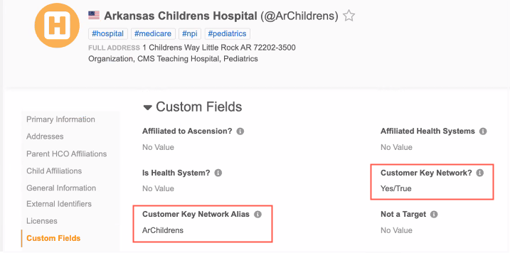 HCOs that you have identified as a key network display the alias beside the HCO name and the custom fields and values on the record profile.