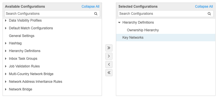 A new node called Key Networks is added to the Available Configurations pane. If you move the node to the Selected Configurations pane, any hierarchies that you added to the Key HCO Network Search are added as dependencies.