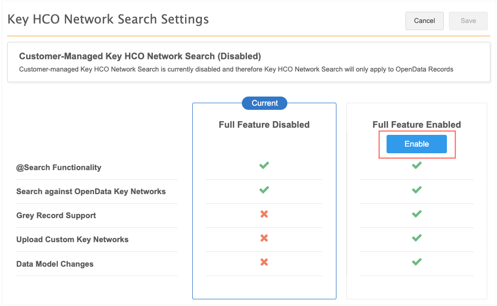 The full Key HCO Network Search Settings feature is not enabled by default.