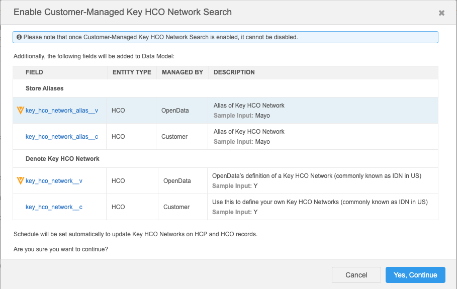 Field Name Label (EN US) Description key_hco_network__v IDN Indicates whether the HCO is a Key Network. Also known as IDN (Integrated Delivery Network). This field is OpenData Managed. key_hco_network_alias__v IDN Alias Alias for Key HCOs. This field is used for Key Network Search and is OpenData Managed. key_hco_network__c Customer Key Network? Indicates whether the HCO is a Key Network by the customer. Also known as IDN (Integrated Delivery Network). This field is customer-managed. key_hco_network_alias__c Customer Key Network Alias Alias for Key HCO Network/IDN defined by the customer. This field is used for Key Network/IDN Search and is Customer managed. Note: If the feature is not enabled, the