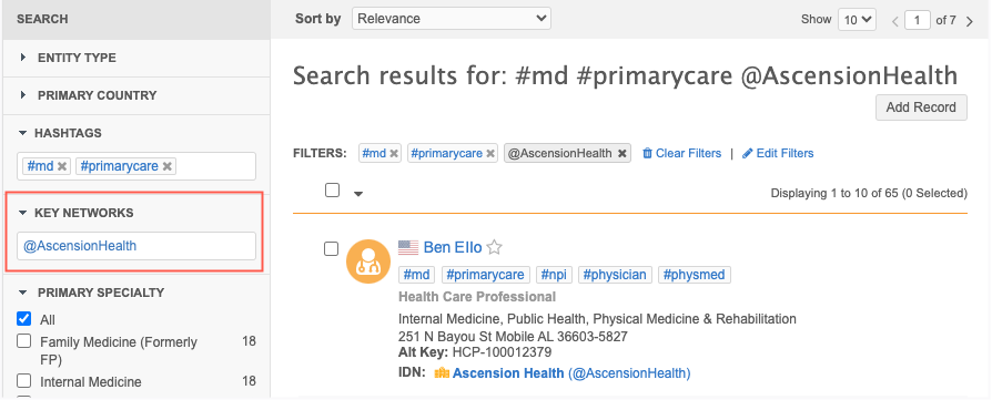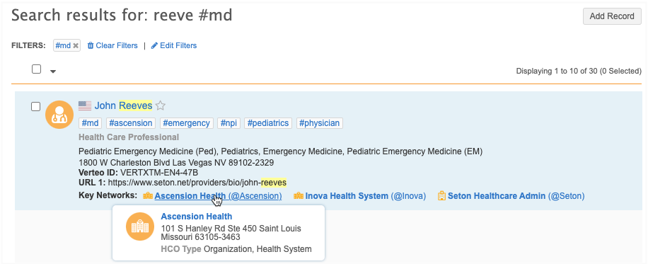 Searching for a record (with or without applying a key network filter) displays the key networks that the HCO or HCP is affiliated with.