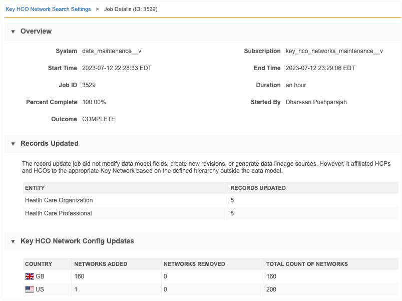 You can view and export the details of the job, including the count of key networks that were added and the HCP and HCO records that were updated.