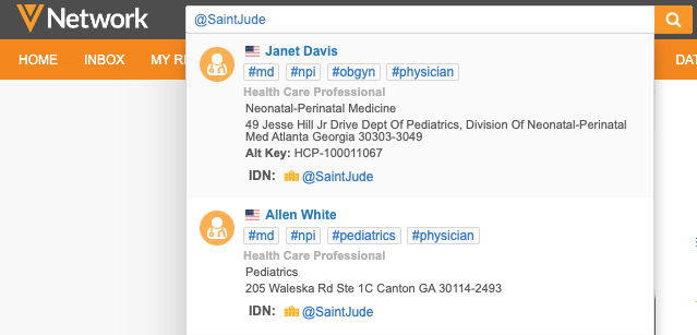 To find key networks or IDNs, type the @ symbol in the search bar. This searches for the HCO's alias (for example, ArChildrens). The list of HCOs identified as key networks in your Network instance and in OpenData display in the type ahead results. Scroll through the quick results to pick a key network.