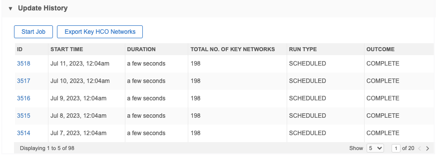 In the Key HCO Network List Update History section, click the ID to view the Job Details page.