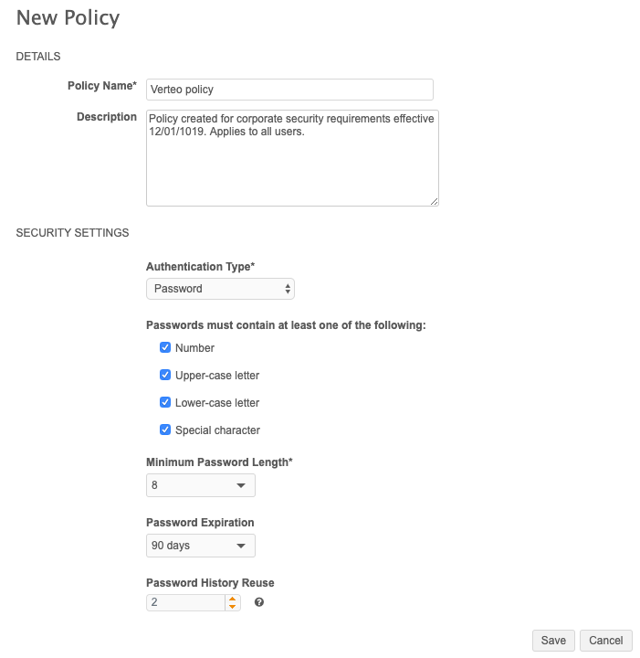 The Security Policies page enables administrators to create and manage password policies for users. These settings control password requirements, expiration period, and the reuse policy.