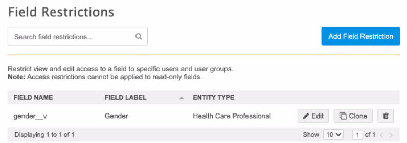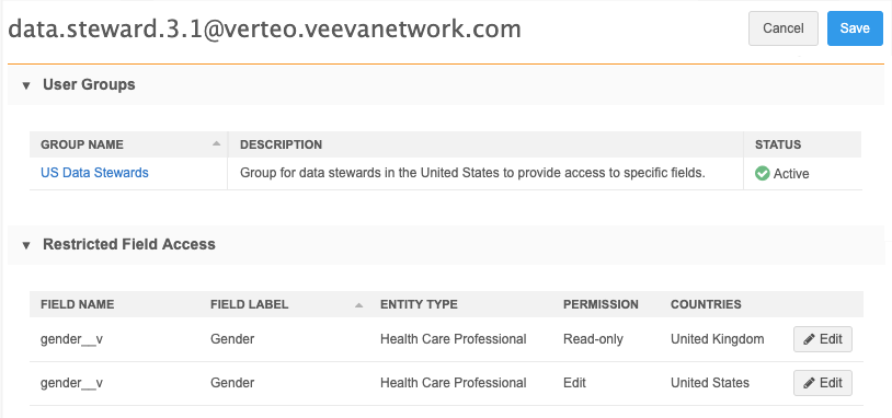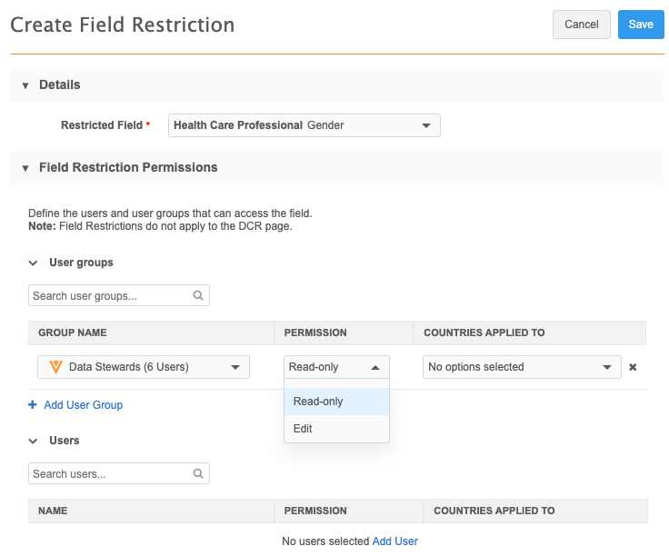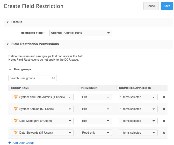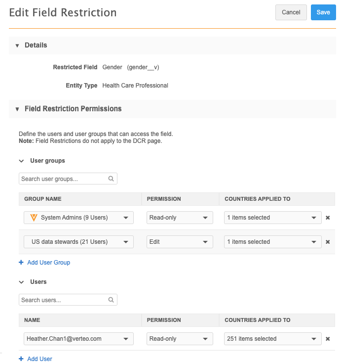 The field restriction is immediately created with the permissions and countries applied for the users.
