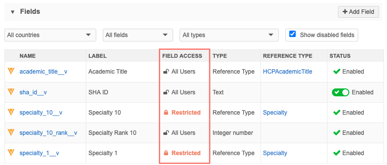 In the data model, administrators and data managers can use a new column, Field Access, to quickly see what fields are available to all users or are restricted.