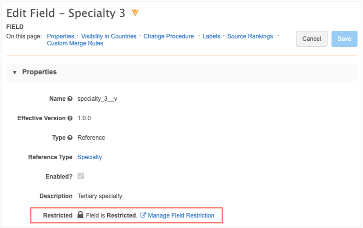 - Click the field name to open the configuration page. The Properties section shows that the field is restricted. Administrators can click the Manage Field Restriction link to navigate to the Field Restrictions page for more information.