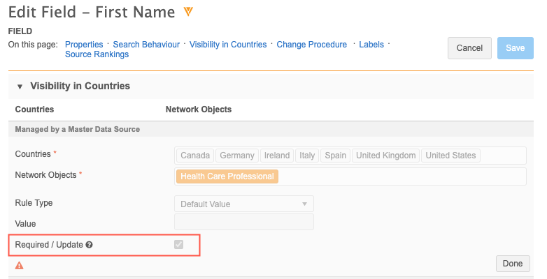 To see if a field is required, open the field's configuration page from the data domain. In the Visibility in Countries section, select a country group and view the Required/Update option.