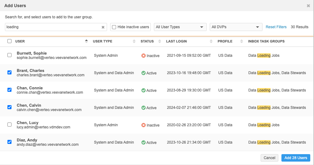 | All Users | All active Network users. | Includes all active users for all user types: System Admins, Data Managers, Data Stewards, Standard Users, System and Data Admins, Portal Users, Integration Users. |