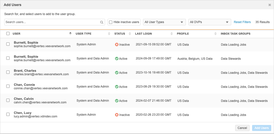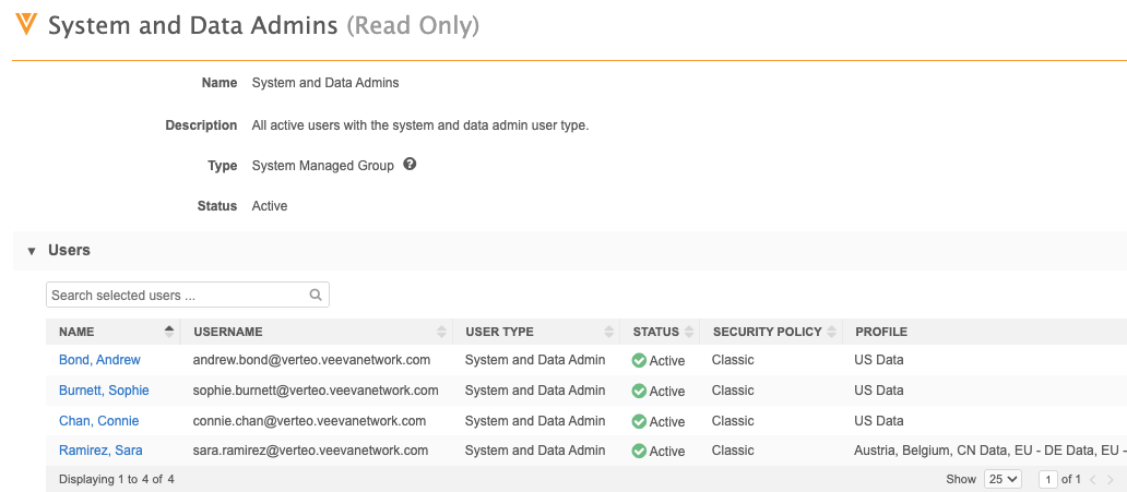 Data managers, System Administrators, and System and Data Admin users. Note: This is a system-managed group, but it is maintained by Admin users for the Veeva OpenData Communications feature. It is not dynamically managed like the other system-managed groups. |