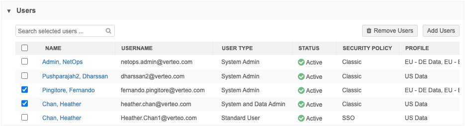 Remove individual users - Select the checkbox beside the user name and click Remove Users.