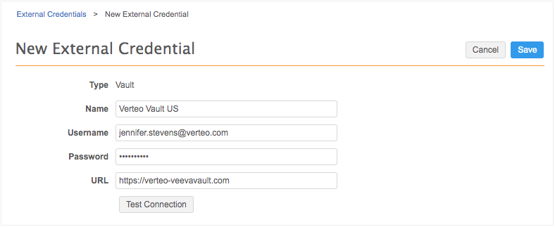 - Name - Type a name for the credential. For example, Verteo Vault US. Names must be unique.