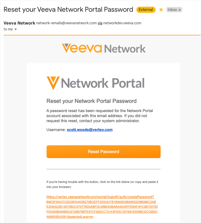 When Administrators reset passwords from the Network UI, Portal users will receive an email that includes their username and a link to Network Portal login page.