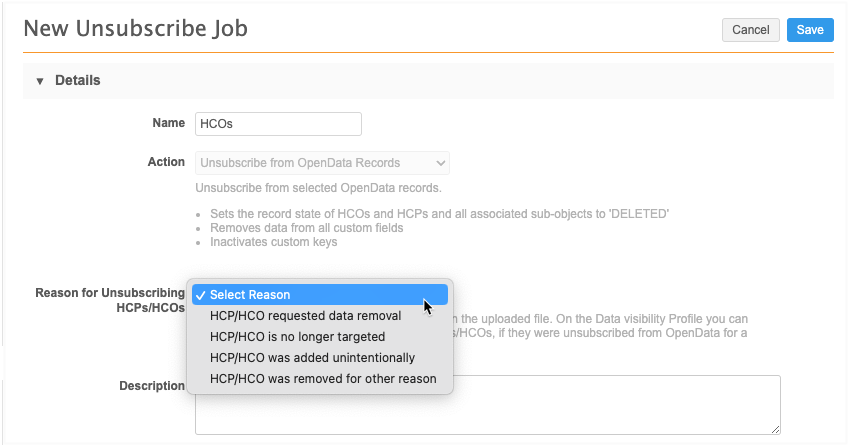 Important: The reason must apply to all the HCP or HCO records that you are unsubscribing in the job. If you are unsubscribing records for other reasons, create a different job for those records.
