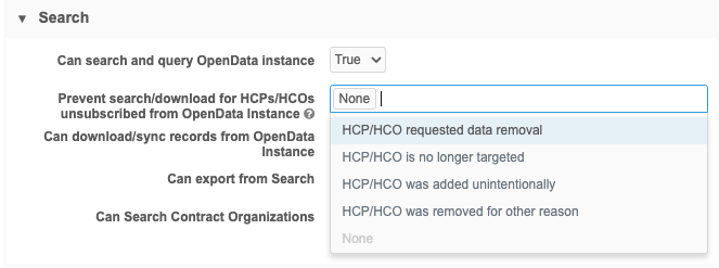 You can now specify a reason when you unsubscribe HCOs and then those records can be filtered from OpenData search results based on that reason using data visibility profile permissions.