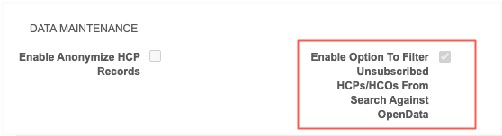 In the Data Maintenance section, select Enable Option to Filter Unsubscribed HCPs/HCOs from Search against OpenData.