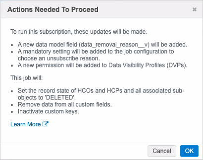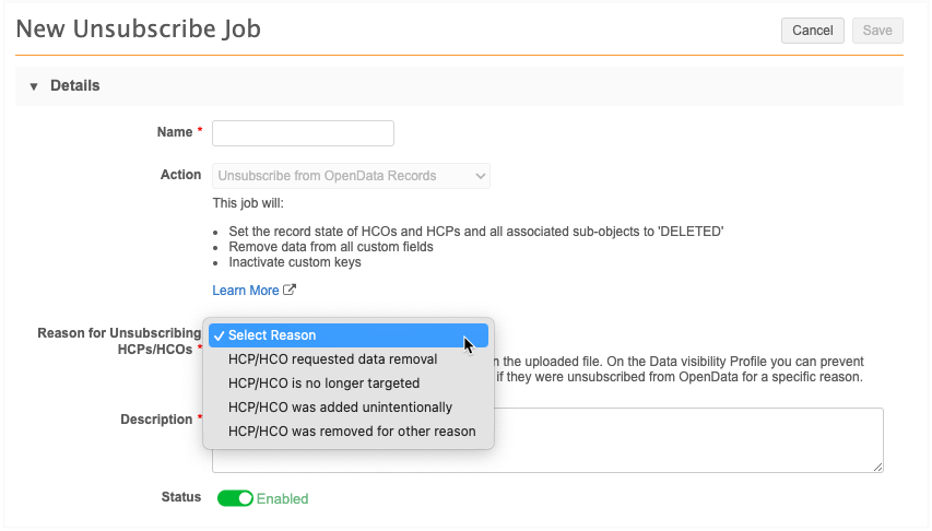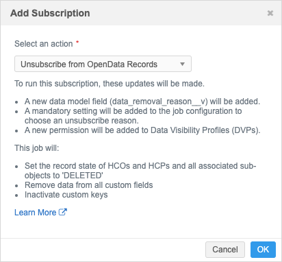 Note: The feature must be enabled before you run the Unsubscribe from OpenData records job. HCP and HCO records that are unsubscribed before the feature is enabled cannot be back-filled with a reason. The access to these records cannot be restricted because they do not include the data removal reason.