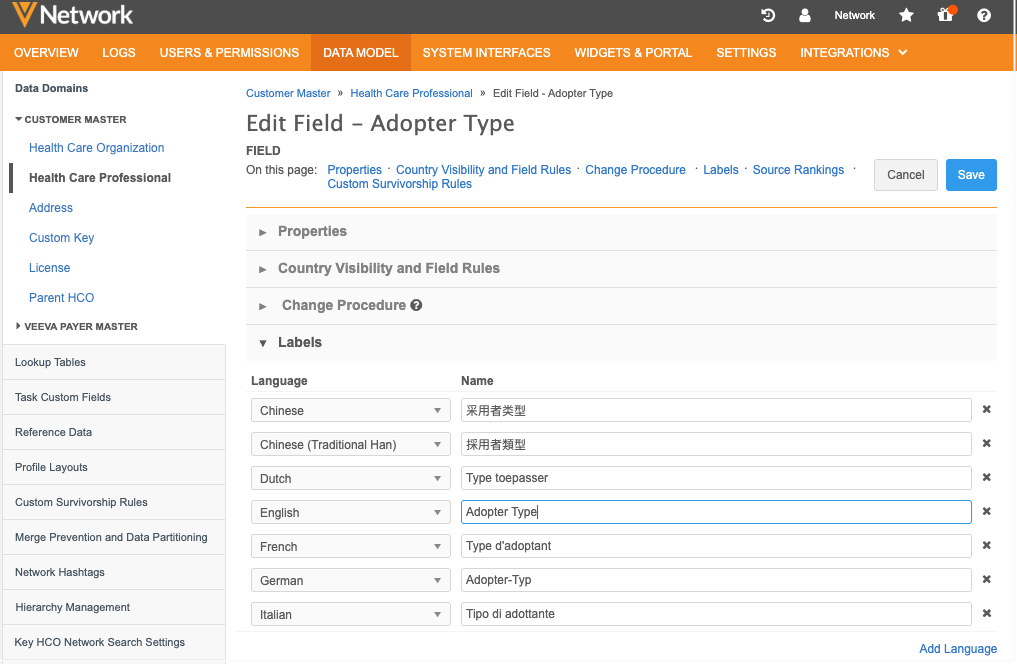 Labels can be added, edited, and removed for any language for the locally managed CDA fields.
