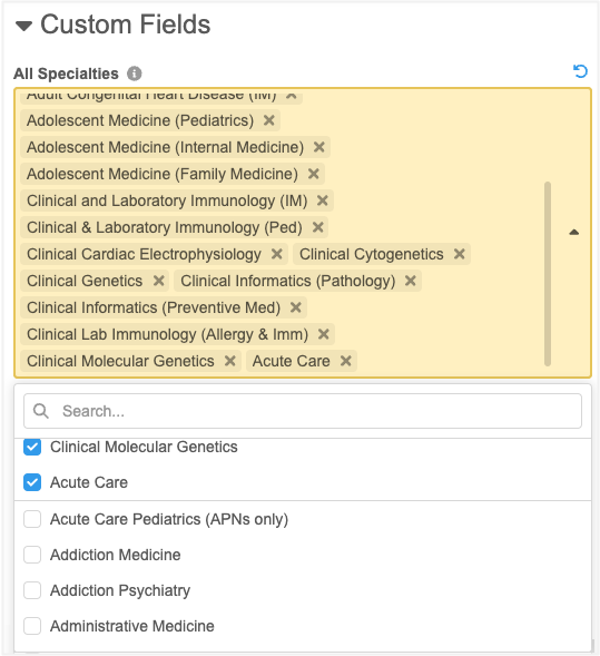 This query returns a count of the values in the all_specialties__c multivalued field.
