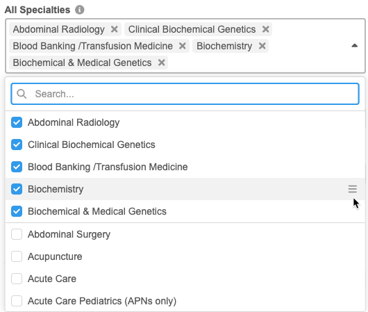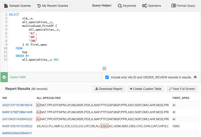 This query returns the reference code that is listed first on the all_specialties__c multivalued field from the provided values (AI, AM, CMG). If none of the reference codes are listed as the value on the field, null is returned.
