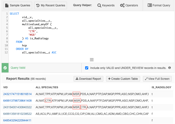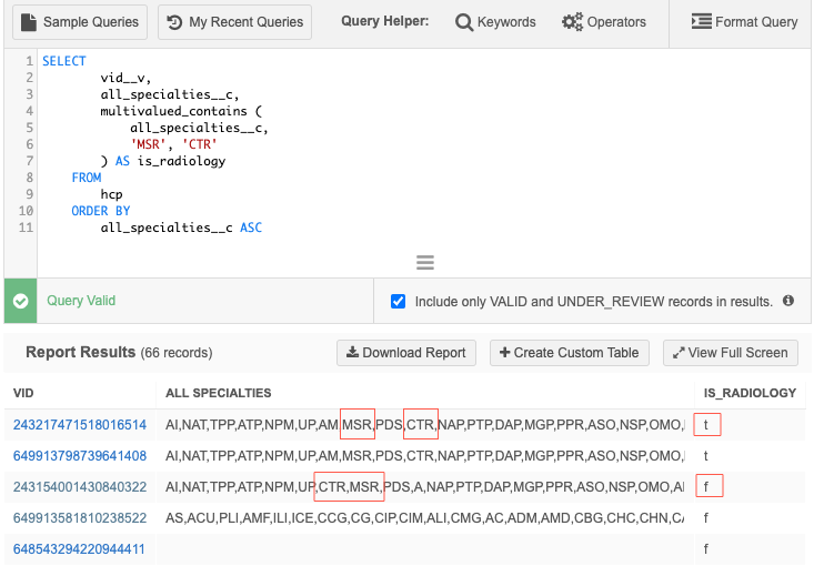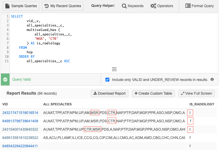 This query returns True if either of the CTR or MSR reference codes are listed as a value anywhere on the all_specialties__c multivalued field, otherwise, False is returned.